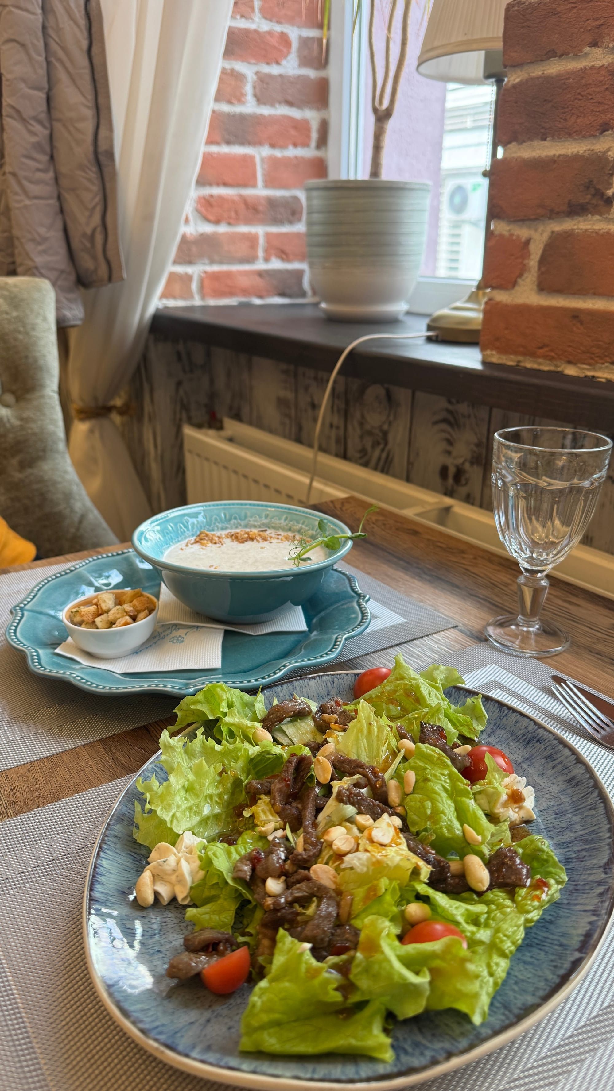 За углом от квартиры плотно пообедали в кафе Каролин (ул. Заслонова, 11). Галушки, суп и салат обошлись в 44 рубля. Было вкусно, быстро и атмосферно, а официант был даже каким-то чересчур любезным😅