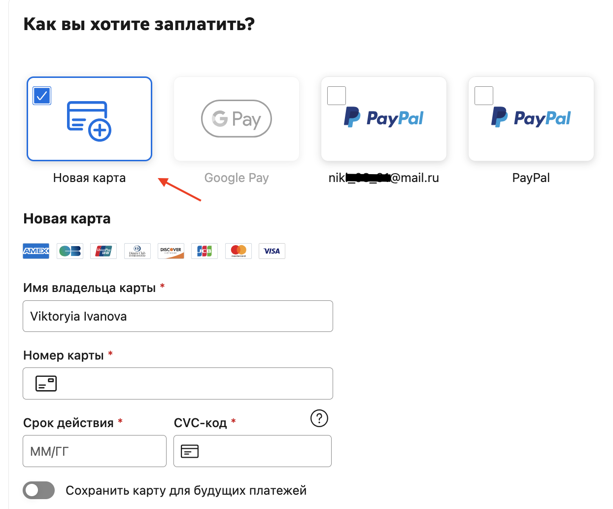 Для этого в способах оплаты выбираем "Новая карта" и вводим ее данные.