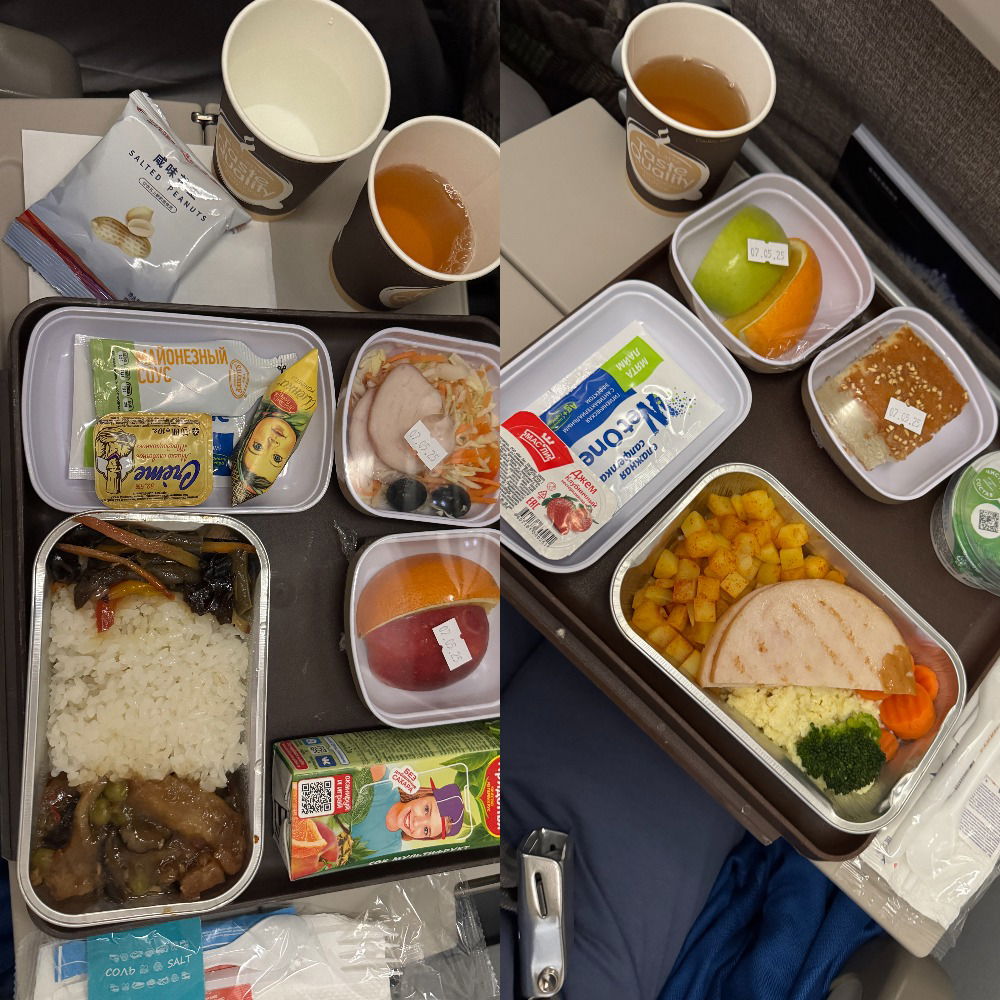 Вообще, у этой а/к можно заранее выбирать питание на борту, но в нашем случае не было даже варианта «курица или рыба»😁. Стюард сразу подошел со словами «извините, у нас только рыба». В целом, я бы ее и выбрала, поэтому мне было ок. Кстати, еда была вкусная и порция достаточная. Алкоголь при этом не предлагали, а вот воду и напитки можно было просить в неограниченном количестве. Наливали мне воду, правда, все время в маленькие стаканчики. Хотела я уже у них бутылку сразу попросить, но скромность не позволила😁.