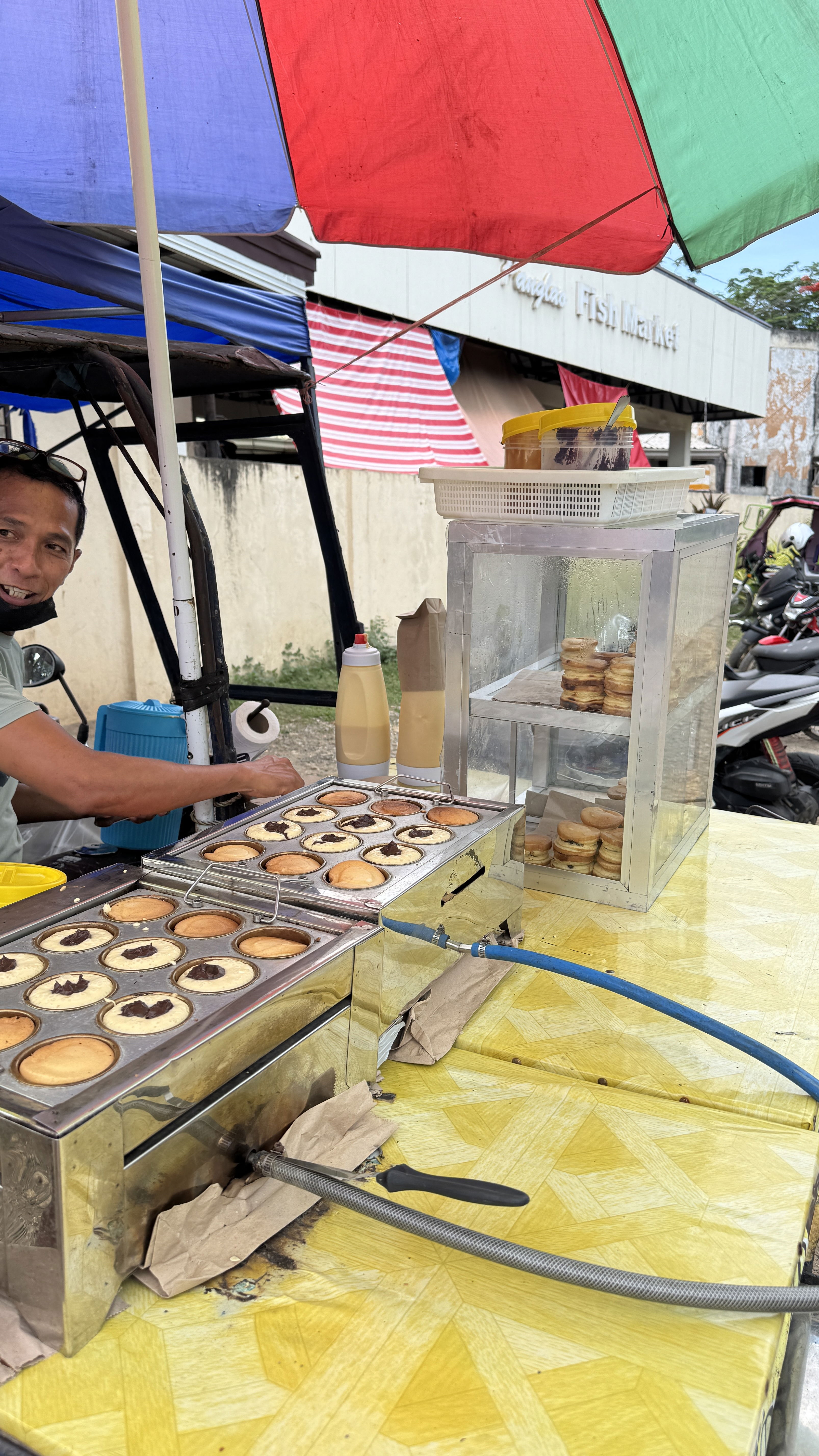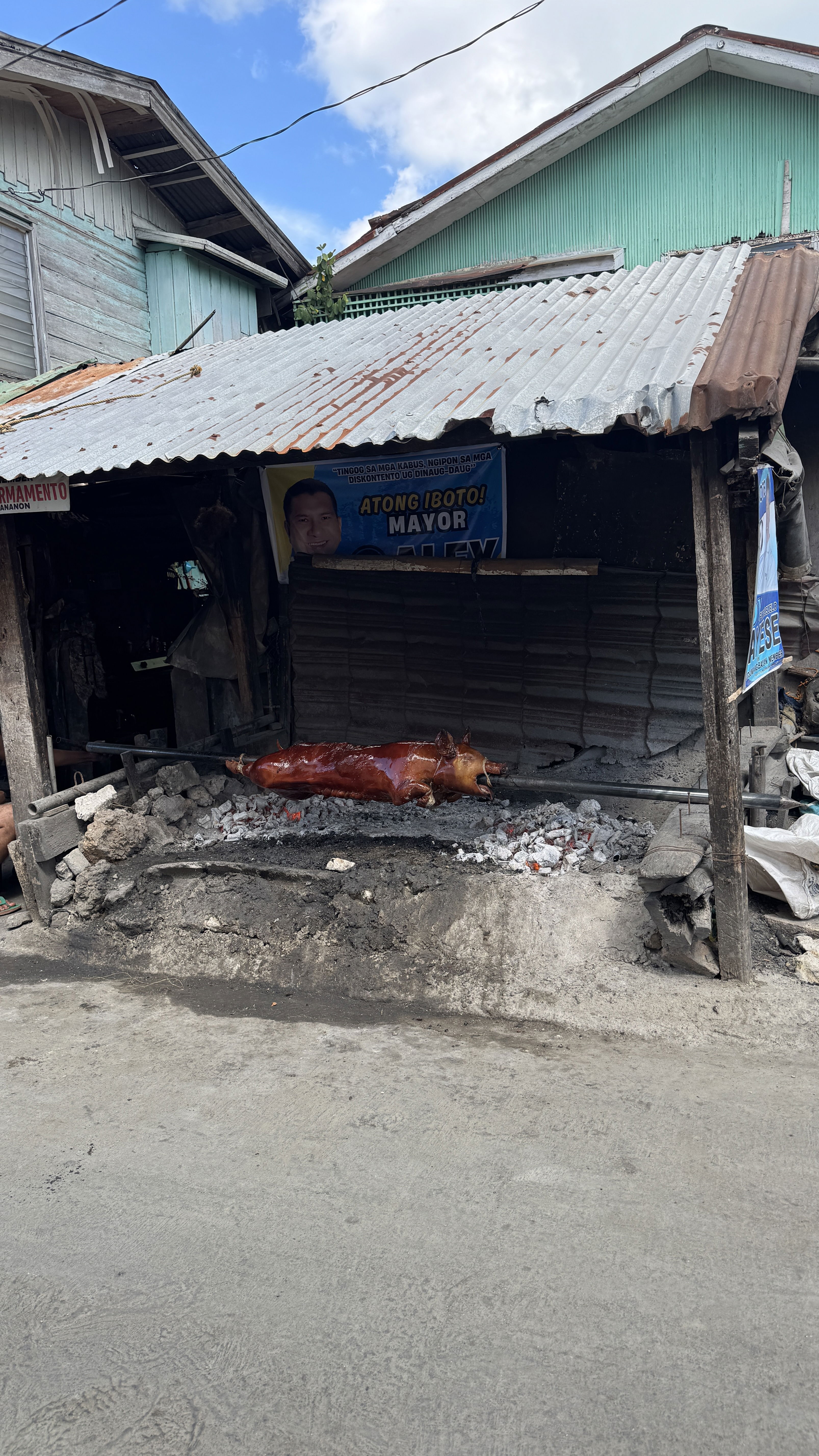 Далее хотели заехать в мангровый сад (ехать сюда надо в прилив) Omagieca Obo-ob Mangrove Garden, но как-то так получилось, что я забыла про платные входы и денег у нас с собой был мизер, который мы уже потратили на пещеру и пляж🤷♀️. Поэтому в сад мы не попали, а поехали в «столицу» острова – город Бантаян. Из интересного там: свинья, которую жарят прямо на улице😅.