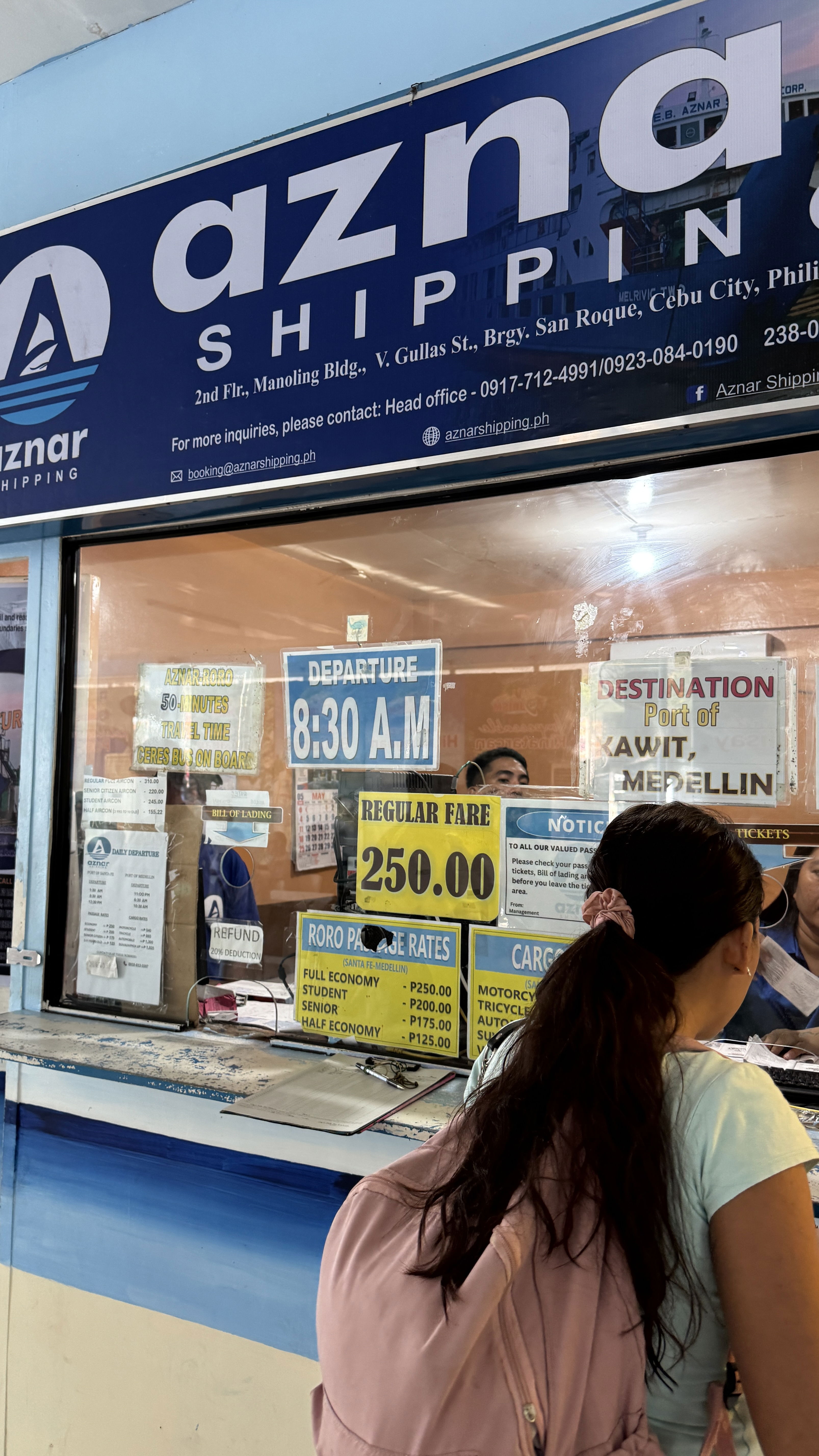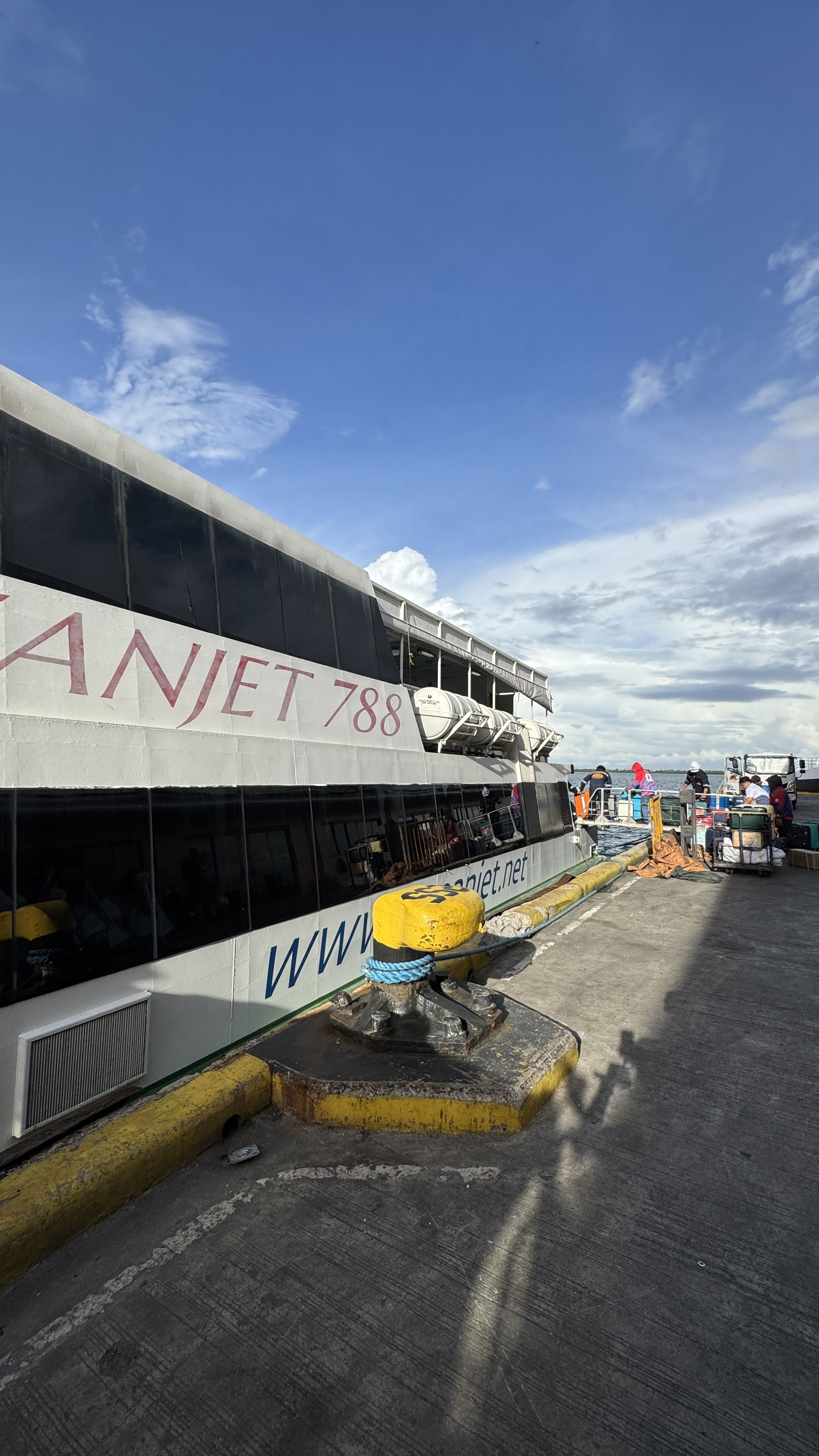 Расстояние в 105 км мы преодолели за … 4 часа🙈. Тем, кто любит быстрые перемещения – точно не на Филиппины. Приехали мы в порт прямо к парому. Судя по расписанию, мы успевали впритык – за 10 минут до отправления только стали в кассу. Купили билеты за 13$ на двоих (вместе с портовым сбором), бегом сели на паром и…ждали еще минут 30 отплытия.